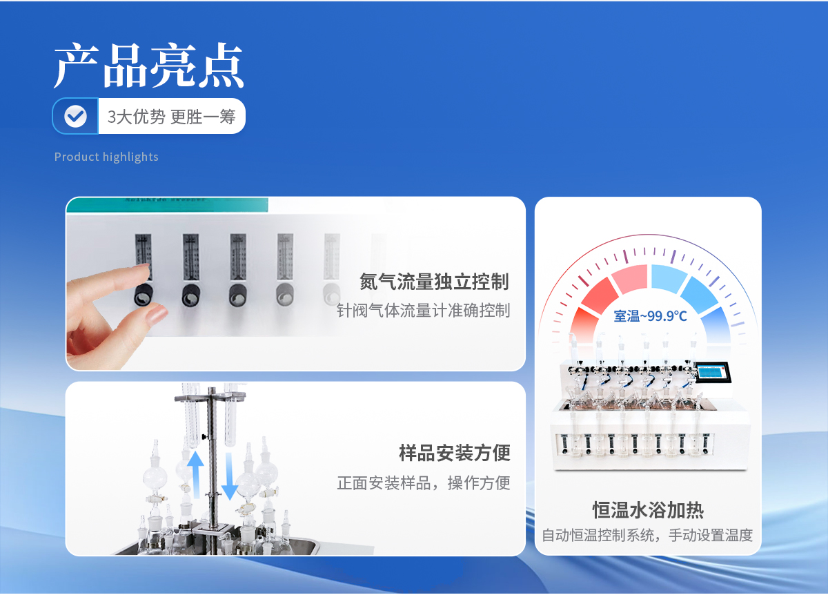 1、大容量反應瓶,可同時處理多個樣品。 2、鹽酸口、氣體進口、出口三口一體且相互獨立,操作會不干擾。 3、恒溫水浴加熱,具有快速自動恒溫控制系統,加熱溫度可以手動設定。 4、由升降位置固定旋鈕調節(jié)樣品架及配氣系統的升降旋轉樣品架,正面安裝樣品,操作方便。 5、每個樣品的氮氣流量獨立控制調節(jié)或關閉,針閥氣體流量計準確控制和顯示氣體總消耗量。