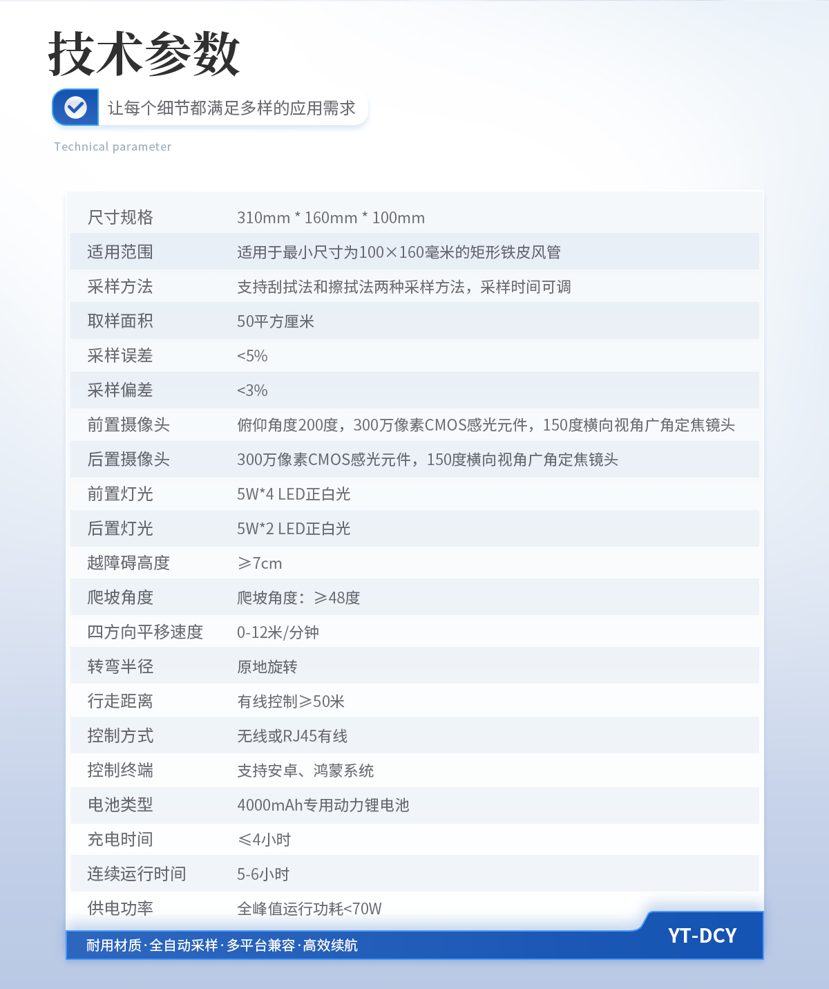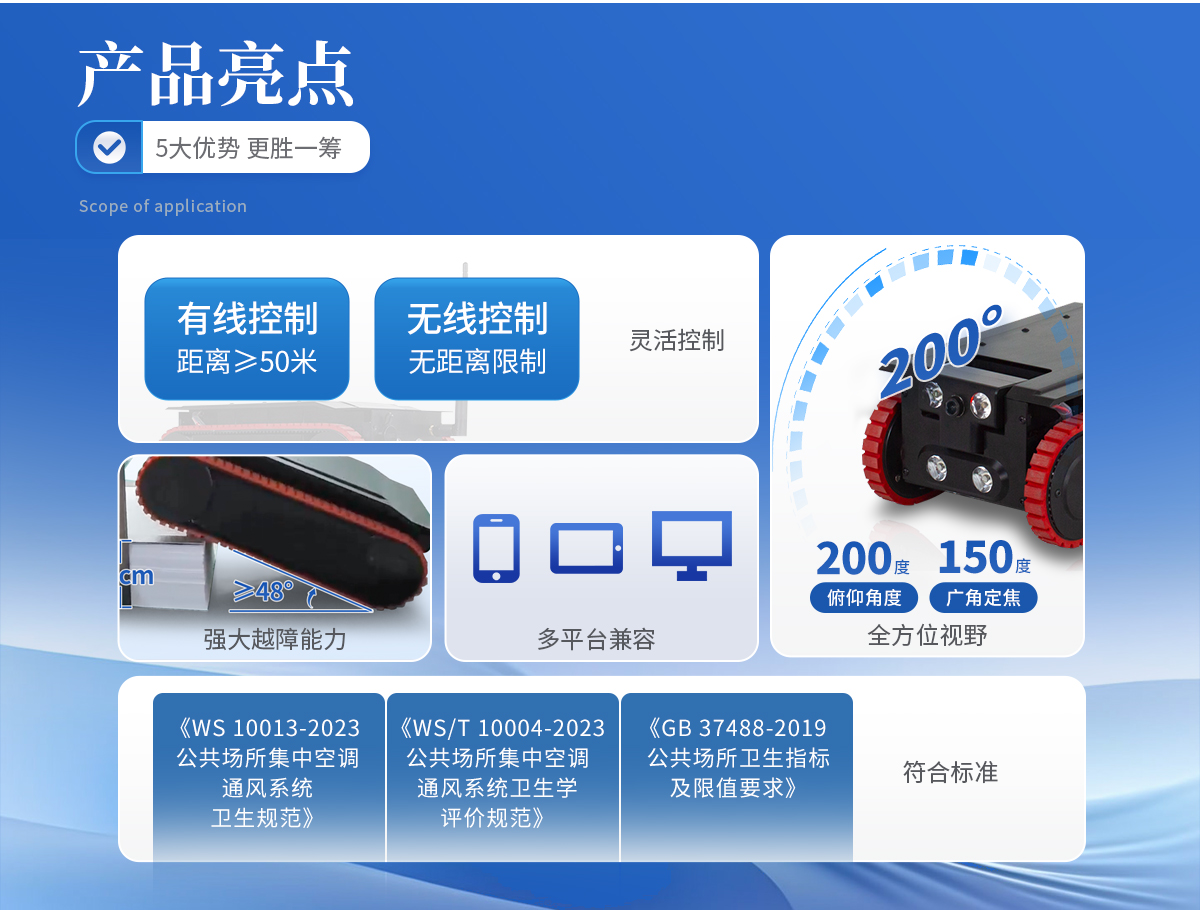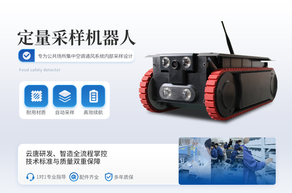 合規(guī)性:完全符合《WS 10013-2023》、《WS/T 10004-2023》及《GB 37488-2019》中對集中空調(diào)定量采樣機器人的要求。 緊湊設計:尺寸長寬高310mm * 160mm * 100mm,可進入*小尺寸為100×160毫米的矩形鐵皮風管內(nèi)部進行采樣。 精準采樣:提供刮拭法和擦拭法兩種采樣方法,采樣器取樣面積50平方厘米,密閉雙采樣器加裝氣流回風道,并使用光固化3D打印技術(shù)制造,保障了采樣面積的有效性。布條和擁有專利設計的刮板夾安裝方便快捷,現(xiàn)場操作時可**限度地杜絕二次污染,實現(xiàn)無菌操作。采樣誤差小于5%,采樣偏差小于3%。 全方位視野:前置攝像頭俯仰角度達200度,前后均采用150度廣角定焦攝像頭,提供無死角視野。 靈活控制:支持無線與有線兩種控制方式,有線控制距離≥50米,無線控制無距離限制。視頻采集、拍照及機器人控制均由終端完成。 強大越障能力:越障礙高度≥7cm,爬坡角度≥48度,整機含電池工作重量僅為4.0KG。 全自動采樣:軟件控制加入了《集塵量采樣》與《微生物采樣》的全自動一鍵采樣功能,無需人工干預即可完成所有采樣動作。 耐用材質(zhì):整機不低于95%的材料使用航空鋁合金,表面經(jīng)過氧化噴砂處理并增厚鈍化膜,增加表面硬度。機體行走模塊一體成型,總重不超過4KG。 多平臺兼容:支持安卓系統(tǒng)、鴻蒙系統(tǒng)的手機、平板、電腦進行控制操作。 **續(xù)航:配備4000mAh容量的動力電池,充電時間≤4小時,單次充電后可持續(xù)運行約5-6小時。