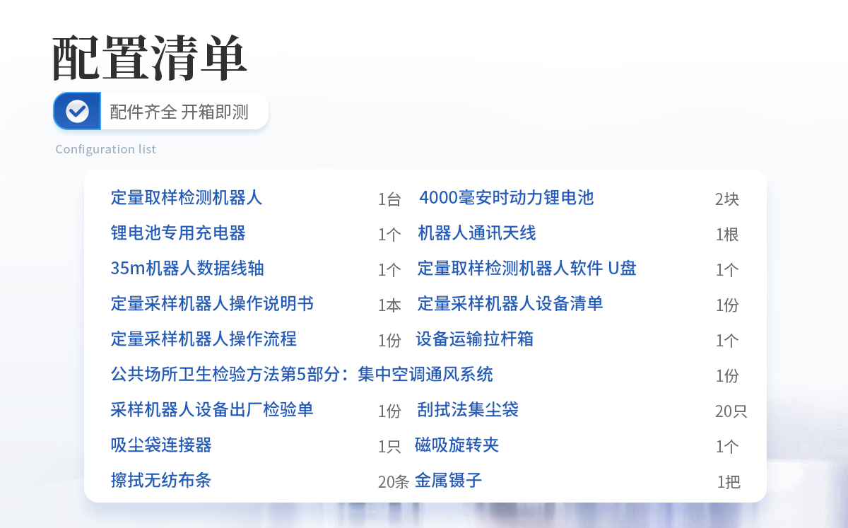 定量取樣檢測機器人:1臺 4000毫安時動力鋰電池:2塊 鋰電池專用充電器:1個 機器人通訊天線:1根 35m機器人數(shù)據(jù)線軸:1個 定量取樣檢測機器人軟件 U盤:1個 定量采樣機器人操作說明書:1本 定量采樣機器人設備清單:1份 定量采樣機器人操作流程:1份 公共場所衛(wèi)生檢驗方法第5部分:集中空調(diào)通風系統(tǒng):1份 采樣機器人設備出廠檢驗單:1份 刮拭法集塵袋 :20只 吸塵袋連接器 :1只 磁吸旋轉(zhuǎn)夾:1個 擦拭無紡布條 :20條 金屬鑷子:1把 設備運輸拉桿箱:1個