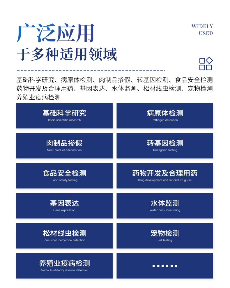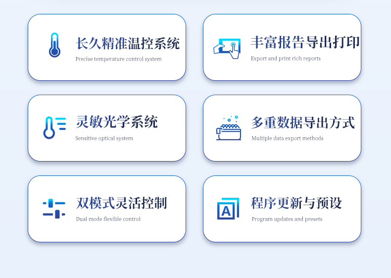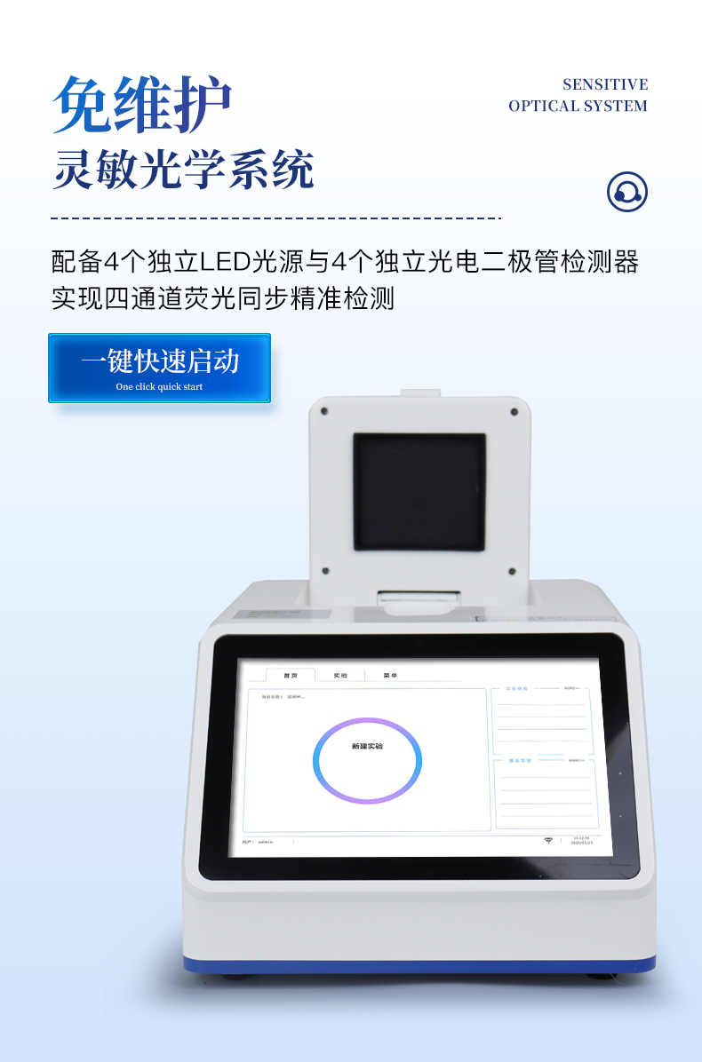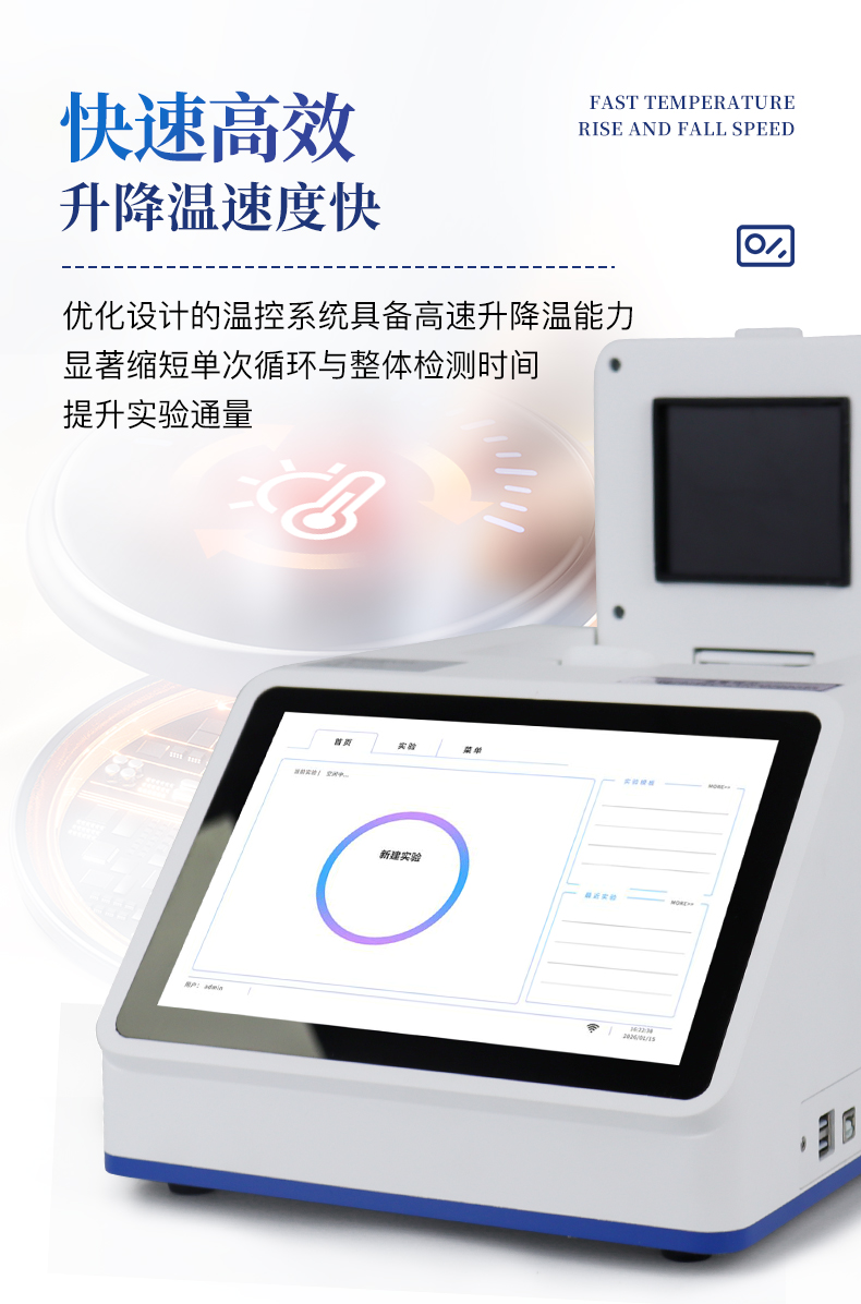 | 1.智能操作系統,實驗盡在掌握 | A程序更新與預設:支持在線更新實驗程序,并內置豐富的預設實驗程序模板,用戶亦可自定義保存常用模版,實現一鍵快速啟動,極大提升操作效率。 | B操作簡單:無論是觸摸屏界面還是電腦軟件,均設計得直觀易懂,新用戶也能快速上手。預置常用程序模板,進一步簡化操作流程。 | 2.精準穩定的溫控與光學核心 | A長久精準的溫控系統:采用進口***TEC半導體制冷模塊,控溫精準(±0.1°C),孔間溫度均勻性**(≤±0.3°C)。系統穩定性卓越,長期使用性能衰減小,校準周期長達數年,顯著降低維護成本與運營中斷。 | B免維護的靈敏光學系統:配備單個獨立LED光源與單個獨立光電二極管檢測器,采用超長壽命進口光源,設計壽命期內免維護,無需額外校準或更換,保障檢測結果長期一致性與高靈敏度。 | C卓越的數據質量:實驗線性相關性高(R2≥0.999),重復性優異(孔間CV值低),確保定量結果準確可靠,數據置信度高。 | 3.**便捷的數據與輸出管理 | A多重數據導出方式:支持通過USB存儲設備直接拷貝,或經由Wi-Fi無線網絡傳輸數據至本地服務器或云端,方便靈活,滿足各類實驗室數據管理習慣。 | B豐富的報告導出與打印:支持生成并導出多種格式(如PDF、Excel)的實驗報告。儀器兼容USB熱敏打印機、藍牙無線打印機及常規A4打印機,可直接在儀器上或通過電腦一鍵導出并打印專業報告,便于結果存檔與即時分享。 | 4.快速**與堅固耐用 | A升降溫速度快:優化設計的溫控系統具備高速升降溫能力,顯著縮短單次循環與整體檢測時間,提升實驗通量。 | B超長使用壽命:核心部件均選用工業級耐用材料與設計,整機運行穩定可靠,致力于為用戶提供長久的投資回報。 |
