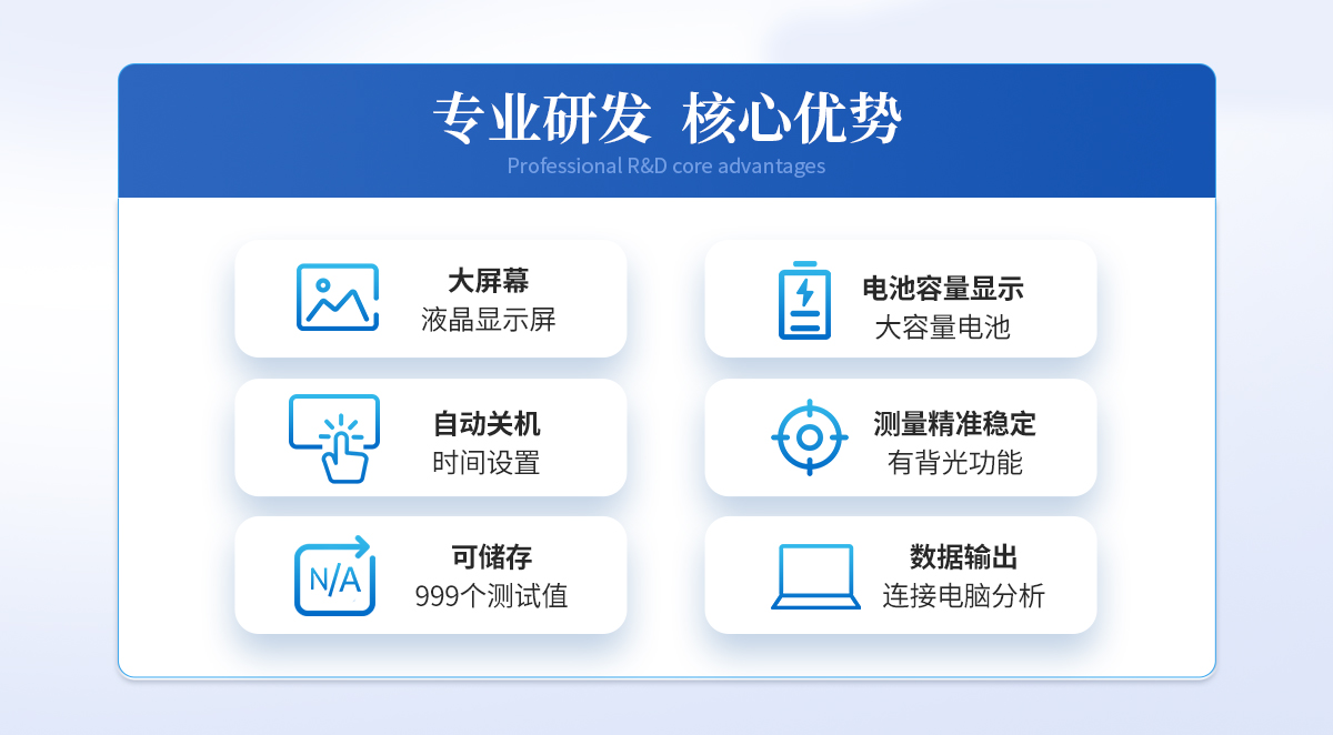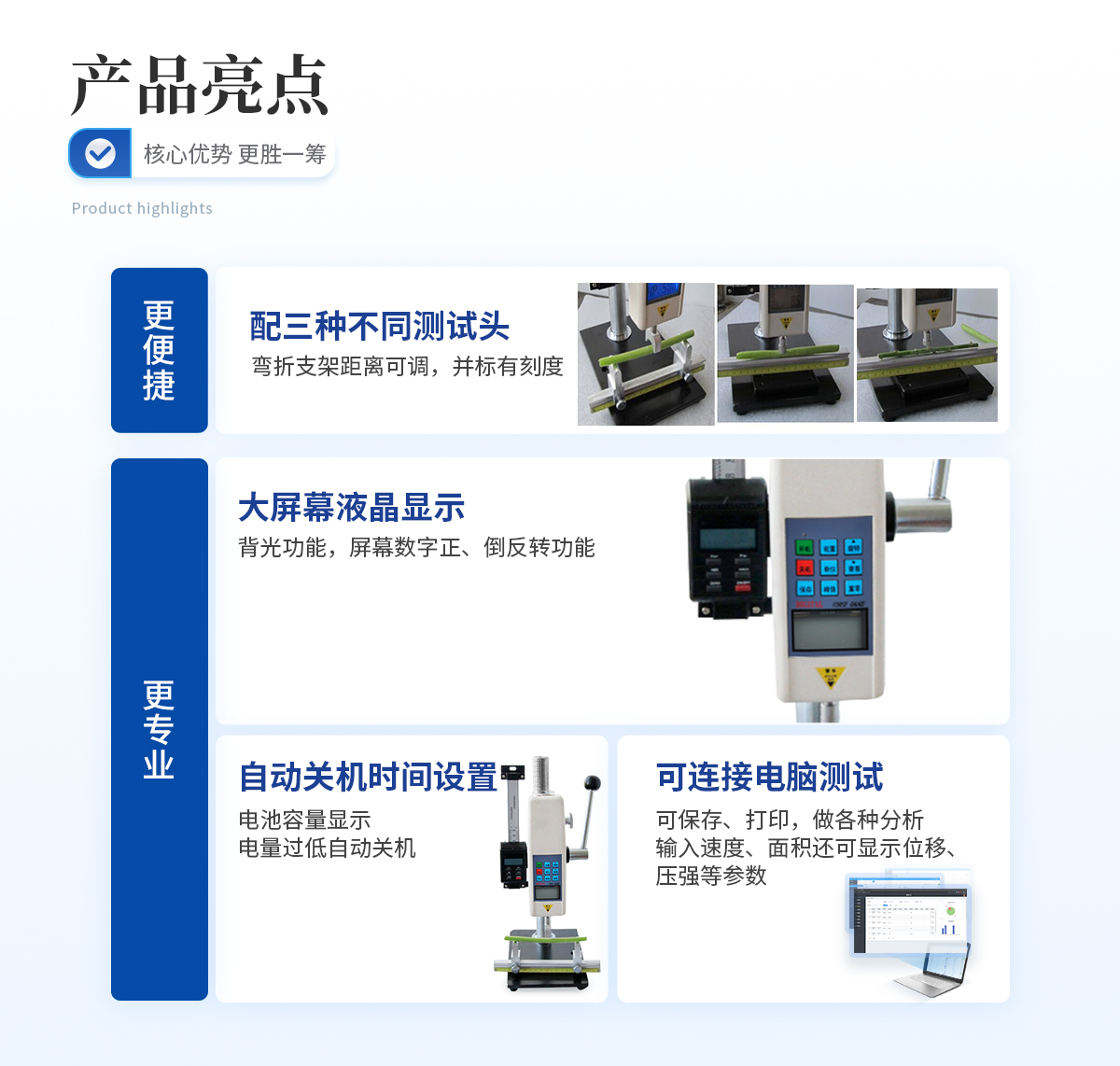 | 1、三種不同測頭:可進(jìn)行莖桿彎折性能測量、莖稈抗壓強(qiáng)度測量、莖桿組織結(jié)構(gòu)(穿刺)強(qiáng)度測量;彎折支架距離可調(diào),并標(biāo)有刻度。 | 2、可配測位移標(biāo)尺 | 3、可連接電腦測試,可保存、打印,做各種分析,輸入速度、面積還可顯示位移、壓強(qiáng)等參數(shù); | 4、可儲(chǔ)存999個(gè)測試值; | 5、大屏幕液晶顯示,有背光功能,并具有屏幕數(shù)字正、倒反轉(zhuǎn)功能; | 6、自動(dòng)關(guān)機(jī)時(shí)間設(shè)置; | 7、電池容量顯示,電量過低自動(dòng)關(guān)機(jī)。 |