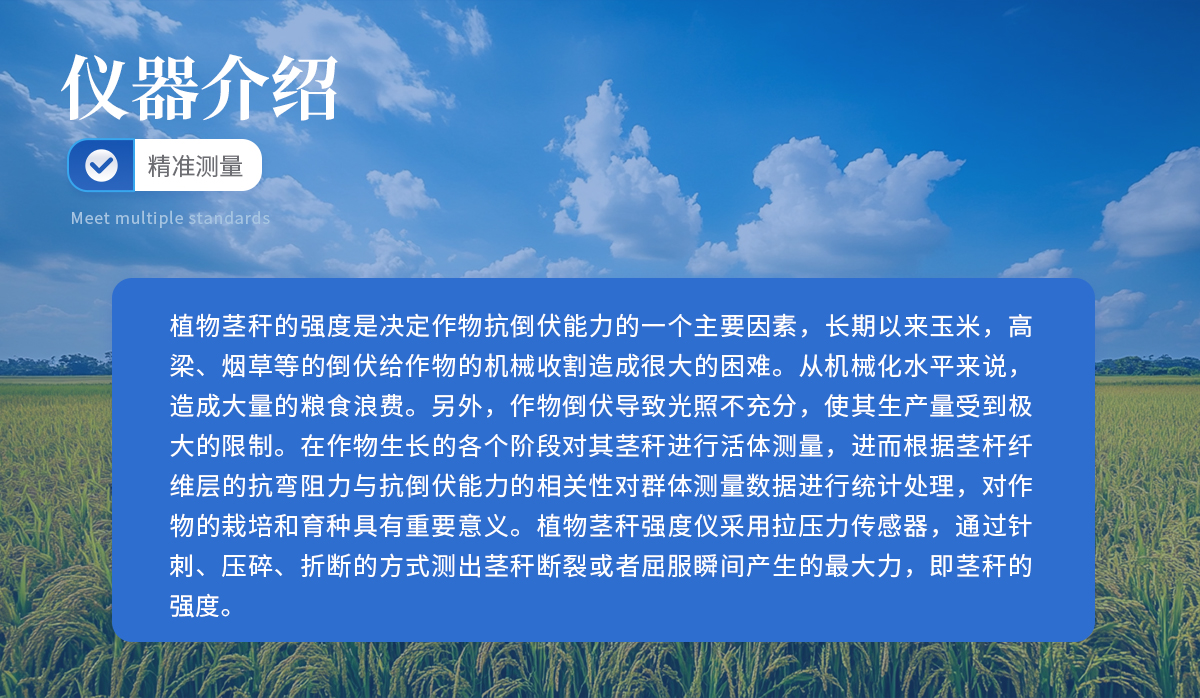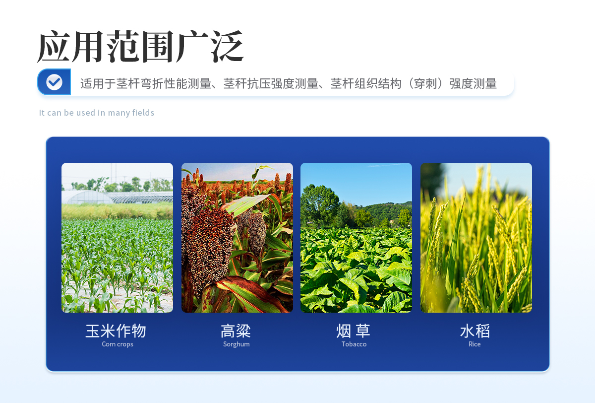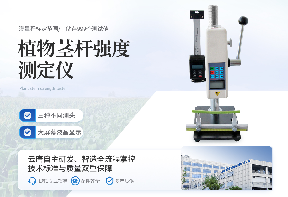 植物莖稈的強(qiáng)度是決定作物抗倒伏能力的一個(gè)主要因素,長期以來玉米,高梁、煙草等的倒伏給作物的機(jī)械收割造成很大的困難。從機(jī)械化水平來說,造成大量的糧食浪費(fèi)。另外,作物倒伏導(dǎo)致光照不充分,使其生產(chǎn)量受到極大的限制。在作物生長的各個(gè)階段對(duì)其莖稈進(jìn)行活體測量,進(jìn)而根據(jù)莖桿纖維層的抗彎阻力與抗倒伏能力的相關(guān)性對(duì)群體測量數(shù)據(jù)進(jìn)行統(tǒng)計(jì)處理,對(duì)作物的栽培和育種具有重要意義。植物莖稈強(qiáng)度儀采用拉壓力傳感器,通過針刺、壓碎、折斷的方式測出莖稈斷裂或者屈服瞬間產(chǎn)生的**力,即莖稈的強(qiáng)度