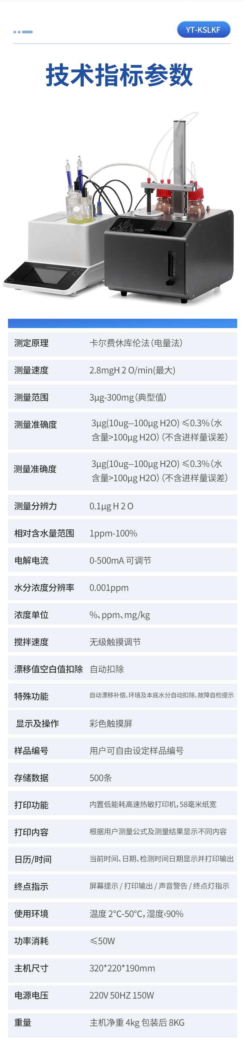 | 1. 采用高精度庫侖法水分測定儀與卡氏加熱爐聯用,**可以檢測到3μg水,精度達到ppm級; | 2. 空芯氣針進樣,和帶加熱功能的氣體輸送管路,零死體積水汽不凝結,操作更簡單,同時也很大的提高了儀器的準確性和重復性; | 3. 5.7寸高清電容觸摸屏,實時顯示測量參數,簡潔明了的功能菜單,全面的參數顯示,操作方便快捷 ; | 4. 內置5種方法可供選擇,8種計算公式方便各種樣品檢測,自定義樣品單位%、ppm、mg/kg等結果單位更加人性化; | 5. 系統實時檢測環境中的水分,精準扣除漂移,采用實時動態阻抗法判定滴定終點,測量結果更精準; | 6. **溫度300℃可以滿足大部分樣品檢測,氣流0-100ml可調,適合各種水分釋放速度的樣品; | 7. 操作方便,用戶只需要設置合適的溫度,合適的流量,把樣品放入事先準備好的樣品瓶,放入加熱器,然后把傳輸針扎入樣品瓶的硅膠墊,在儀器上點開始測量即可; | 8. 無需等待上一次樣品瓶冷卻之后才能進行下一次樣品測量,更換樣品瓶過程中樣品瓶始終保持密封狀態,測量效率更高更準確,尤其是吸濕性強的樣品無需擔心空氣中水分的干擾; | 9. 采用頂空進樣的方式,保證每個測定采用“新”的樣品瓶,樣品測定無交叉感染。樣品瓶體積小,確保較小的死體積和背景水分值。獨立密閉樣品瓶,測定時無需樣品轉移,結果更準確; | 10. 旋蓋式樣品瓶,無需專用且昂貴的壓蓋器和開蓋器,使用非常方便; | 11. 頂空進樣技術,只有氣體進入水分測定儀反應杯,不污染反應杯及電解電極。 |