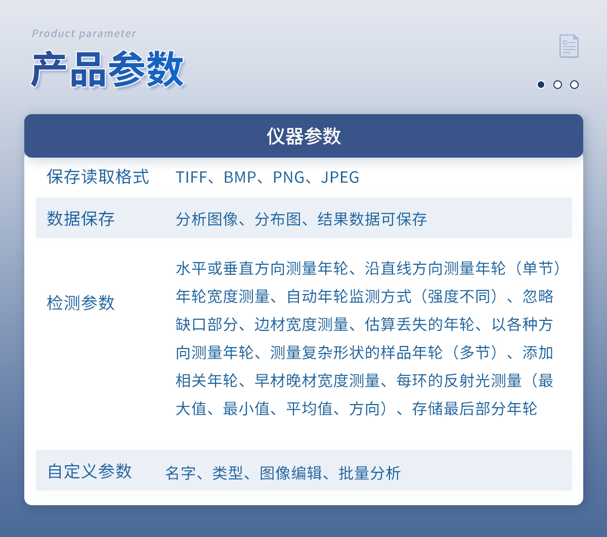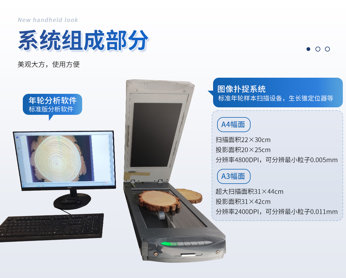 圖像撲捉系統:標準年輪樣本掃描設備,生長錐定位器等。 A4幅面:掃描面積22×30cm,投影面積20×25cm,分辨率4800DPI,可分辨*小粒子0.005mm A3幅面:超大掃描面積31×44cm,投影面積31×42cm,分辨率2400DPI,可分辨*小粒子0.011mm 年輪分析軟件:標準版分析軟件。