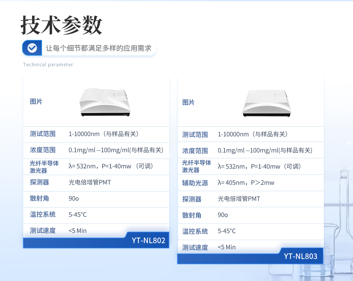 | 規格型號:YT-NL803 | 執行標準:GB/T 19627-2005/ISO 13321-1996 GB/T 29022-2012/ISO 22412-2008 | 測試范圍 :1-10000nm(與樣品有關) | 濃度范圍:0.1mg/ml--100mg/ml(與樣品有關) | 準確度誤差:<1%(國家標準樣品d50值)> | 重復性誤差:<1%(國家標準樣品d50值)> | 激光光源:光纖半導體激光器,λ= 532nm,P=1-40mw(可調) 輔助激光器,λ= 405nm,P>2mw | 探測器:光電倍增管PMT | 散射角:90o | 樣品池體積:10mm*10mm*40mm, 1--4mL | 溫控范圍:5-45℃ | 溫控精度:0.1℃ | 測試速度:<5 min=""> | 數字相關器主要參數: (1)規格型號 CR256 (2)自相關通道 256 (3)基線通道 4 (4)物理通道數 5000 (5)延遲時間 100ns-10ms(可調) | 體積:480mm*270mm*170mm | 重量:12Kg |
