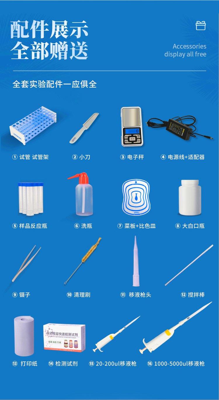 | 機器采用全新安卓智能系統,主控芯片采用 ARM Cortex-A7,RK3288/4核處理器,主頻1.88Ghz,運轉速度更快速,穩定性更強。 | 創新檢測模式: *儀器采用精密旋轉比色池設計,使用光源一致,可以解決各通道間由于光源誤差帶來的檢測結果誤差問題,檢測結果更加精準。 *儀器具有自動識別比色皿檢測功能,即:將樣品比色皿放入儀器后,點擊樣品檢測,儀器自動識別比色皿進行通道檢測。 | 供電方式:交直流兩用,直流 12V 供電,可連接車載電源,可配 6ah 大容量充電鋰電池,方便戶外流動測試。 | 顯示方式:7英寸液晶觸摸屏顯示,人性化中文操作界面,讀數直觀、簡單。 | 檢測通道:12個檢測通道,可以同時測試多個樣品,循環檢測,即放即檢,每個樣品由程序控制分別獨立工作,不會互相干擾。 | 高精光源系統: ①儀器光源采用進口超高亮發光二極管,光源亮度可以自動調節與校準 ②智能恒流穩壓,光強自動校準,長時間連續工作光源無溫漂現象。 | 智能操作分析系統: ①儀器具有100多種蔬菜名稱菜單庫,分類管理,并可按需添加或刪除、編輯蔬菜名稱;可在同一檢測界面自動對應相關檢測通道一次性選擇1-24個樣品名稱,無需退出界面,節省操作時間。 ②內置新國家限量標準,與所測結果進行現場比對,并持續更新標準。 | 完善的配套硬件: ①采用串口5v打印機,可選擇手動打印或者自動打印,三分鐘出打印結果,打印格式為檢測人姓名、吸光度差值、檢測時間、檢測機構、樣品名稱及結果判定。 ②儀器具有無線上傳模塊,檢測結果可批量打印,批量上傳。 | 數據調用: ①儀器可存儲20萬條檢測結果, ②檢測結果為Excel表格,方便后期進行數據分析與匯總報告 ③儀器采用USB2.0接口設計,支持 U 盤存儲,方便數據的存貯和移動,并可隨時與計算機直接相連,實現數據查詢、瀏覽、分析、統計、打印等。 | 后期產品固件可升級。 | 安全證書,放心保障:儀器具有中國計量科學研究院校準證書,權威認證,使用放心。 | 機箱采用工業級ABS工程塑料箱,方便攜帶,穩固耐用,便于流動測試。 |