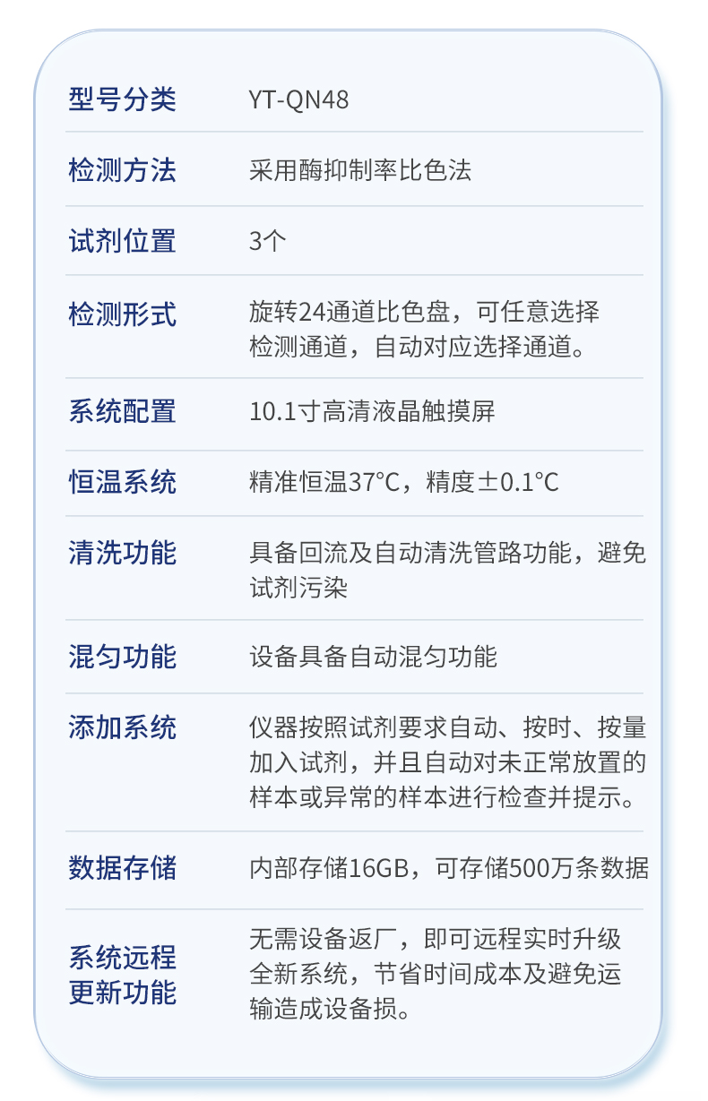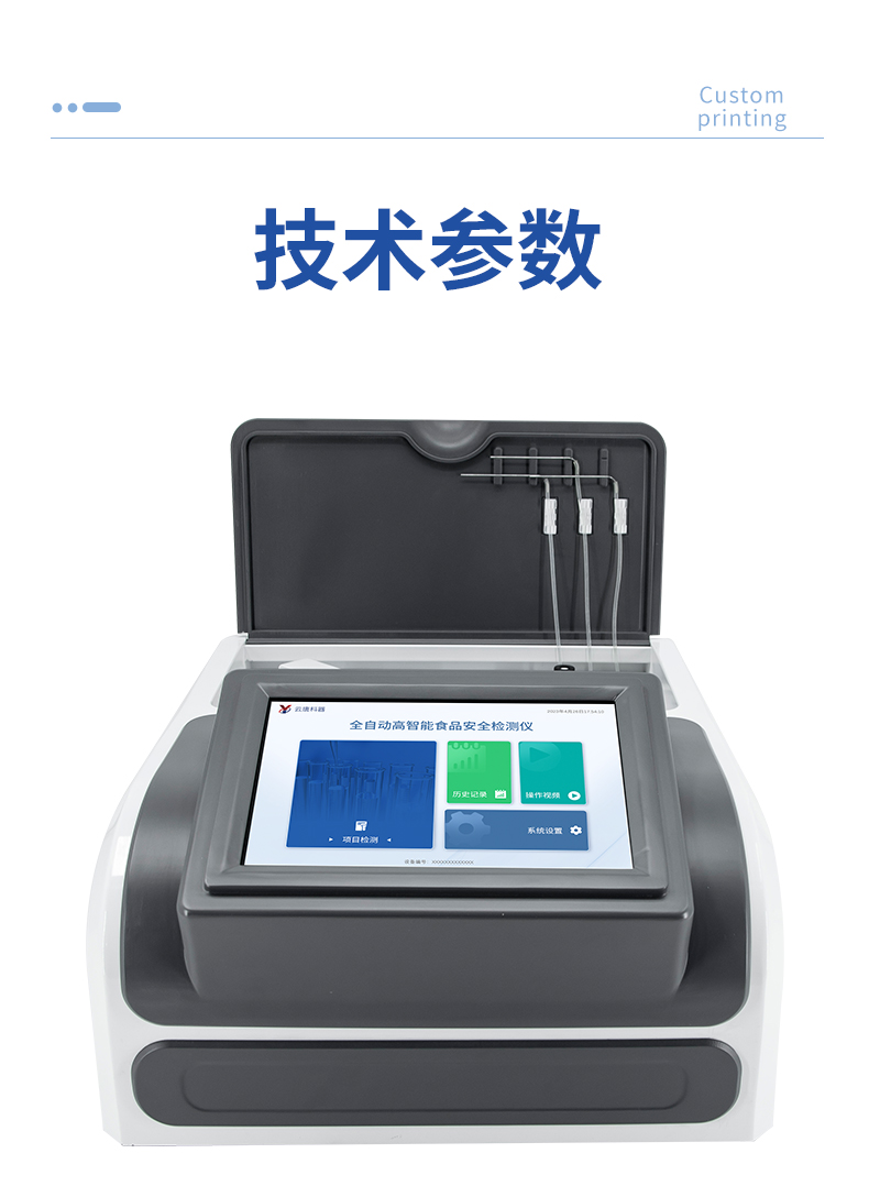 | 1. 試劑位置:3個(gè) | 2. 檢測(cè)形式:旋轉(zhuǎn)48通道比色盤(pán),可任意選擇檢測(cè)通道,自動(dòng)對(duì)應(yīng)選擇通道。 | 3. 系統(tǒng)配置:10.1寸高清液晶觸摸屏,采用ARM Cortex-A7,RK3288/4核處理器,運(yùn)行內(nèi)存1GB。Android7.1.1 系統(tǒng)分辨率1280×800。 | 4.恒溫系統(tǒng):具有自動(dòng)加溫溫控系統(tǒng),精準(zhǔn)恒溫37℃,精度±0.1℃。 | 5.添加系統(tǒng):儀器按照試劑要求自動(dòng)、按時(shí)、按量加入試劑,并且自動(dòng)對(duì)未正常放置的樣本或異常的樣本進(jìn)行檢查并提示。 | 6.清洗功能:儀器具備回流及自動(dòng)清洗管路功能,避免試劑污染。 | 7.混勻功能:設(shè)備具備自動(dòng)混勻功能。 | 8.光源校準(zhǔn):設(shè)備可自動(dòng)校準(zhǔn),確保檢測(cè)準(zhǔn)確度。 | 9.實(shí)時(shí)監(jiān)控:儀器測(cè)試過(guò)程中屏幕顯示運(yùn)行狀態(tài),可實(shí)時(shí)查看。 | 10.數(shù)據(jù)存儲(chǔ):內(nèi)部存儲(chǔ)16GB,可存儲(chǔ)500萬(wàn)條數(shù)據(jù)。 | 11.樣品多選功能:設(shè)備具備樣品一鍵多選功能,選擇樣品自動(dòng)匹配檢測(cè)通道。 | 12.項(xiàng)目預(yù)設(shè):可提前設(shè)置單個(gè)及多個(gè)相同或不相同的檢測(cè)任務(wù),可單次或者多次調(diào)取,減少檢測(cè)時(shí)間。 | 13.自定義打印系統(tǒng):內(nèi)置自定義打印系統(tǒng),可按需靈活設(shè)置開(kāi)啟或關(guān)閉:產(chǎn)品合格證(國(guó)家農(nóng)業(yè)部標(biāo)準(zhǔn)),二維碼,抽樣信息、檢測(cè)信息,受檢信息等信息的打印。 | 14.A4版本報(bào)告打印功能:設(shè)備可自動(dòng)生成A4版報(bào)告,A4報(bào)告帶二維碼,可掃描二維碼生成電子版,并可識(shí)別真?zhèn)巍?/td> | 15.傳輸方式:儀器配備無(wú)線通信模塊: 4G(APN)通訊模塊、Wifi模塊,藍(lán)牙傳輸模塊,同時(shí)具有USB接口以及RJ45接口能以多種方式實(shí)現(xiàn)數(shù)據(jù)保存和數(shù)據(jù)傳輸功能,設(shè)備數(shù)據(jù)可以同步上傳至平臺(tái)。 | 16.數(shù)據(jù)監(jiān)管系統(tǒng):設(shè)備自帶監(jiān)管平臺(tái),并可同步對(duì)接監(jiān)管平臺(tái),數(shù)據(jù)可局域網(wǎng)和互聯(lián)網(wǎng)數(shù)據(jù)上傳,檢測(cè)結(jié)果可直接傳至食品安全監(jiān)管平臺(tái)。達(dá)到食品安全問(wèn)題預(yù)估、預(yù)警。 | 17.系統(tǒng)遠(yuǎn)程更新功能:無(wú)需設(shè)備返廠,即可遠(yuǎn)程實(shí)時(shí)升級(jí)全新系統(tǒng),節(jié)省時(shí)間成本及避免運(yùn)輸造成設(shè)備損。 |