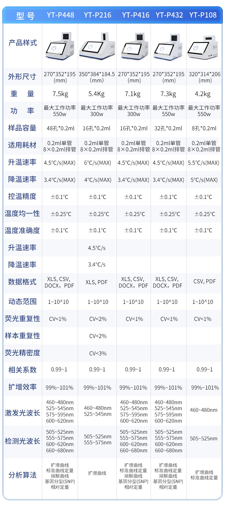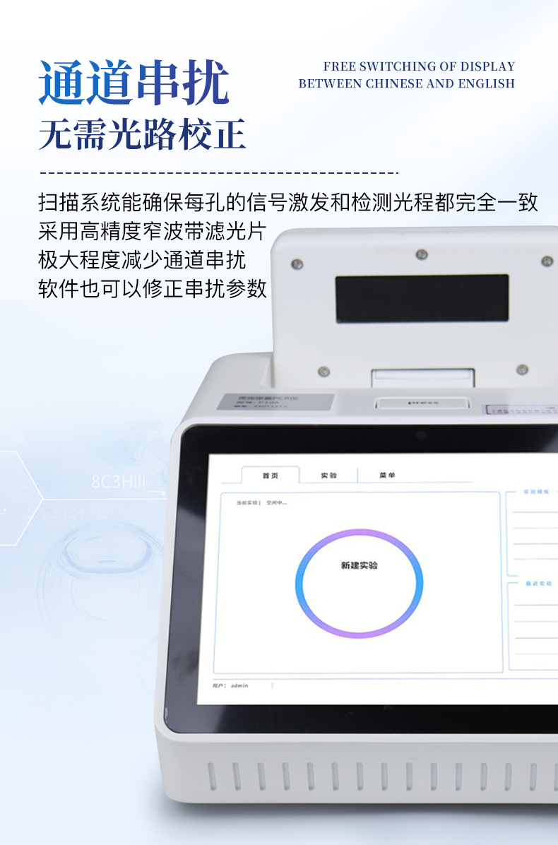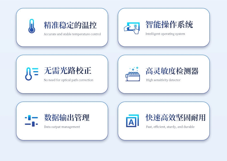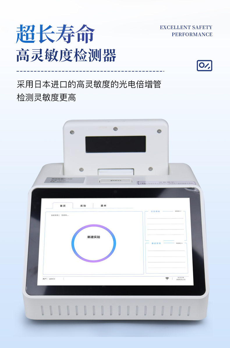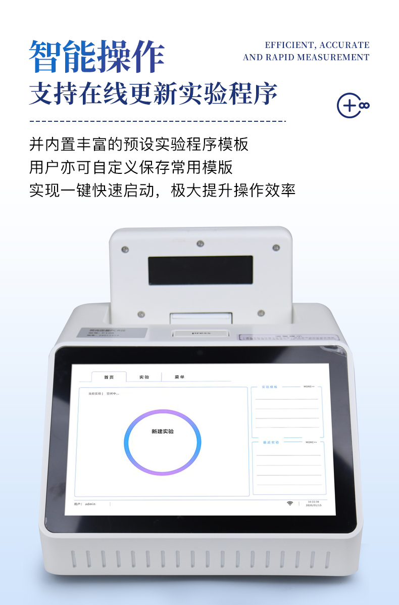 | 1.智能操作系統,實驗盡在掌握 | A程序更新與預設:支持在線更新實驗程序,并內置豐富的預設實驗程序模板,用戶亦可自定義保存常用模版,實現一鍵快速啟動,極大提升操作效率。 | B極簡啟動體驗(可選配):可定制集成攝像頭掃描系統,用戶只需掃描樣品板或程序卡的二維碼,即可自動識別并調用對應實驗程序,簡化流程,避免人為設置錯誤。 | C操作簡單:觸摸屏界面設計得直觀易懂,新用戶也能快速上手。預置常用程序模板,進一步簡化操作流程。 | 2.精準穩定的溫控與光學核心 | A長久精準的溫控系統:采用進口***TEC半導體制冷模塊,控溫精準(±0.1°C),孔間溫度均勻性**(≤±0.3°C)。系統穩定性卓越,長期使用性能衰減小,校準周期長達數年,顯著降低維護成本與運營中斷。 | B免維護的靈敏光學系統:配備2個獨立LED光源與2個獨立光電二極管檢測器,實現雙通道熒光同步精準檢測。采用超長壽命進口光源,設計壽命期內免維護,無需額外校準或更換,保障檢測結果長期一致性與高靈敏度。 | C卓越的數據質量:實驗線性相關性高(R2≥0.999),重復性優異(孔間CV值低),確保定量結果準確可靠,數據置信度高。 | 3.**便捷的數據與輸出管理 | A多重數據導出方式:支持通過USB存儲設備直接拷貝,或經由Wi-Fi無線網絡傳輸數據至本地服務器或云端,方便靈活,滿足各類實驗室數據管理習慣。(可選配) | B豐富的報告導出與打印:支持生成并導出多種格式(如PDF、Excel)的實驗報告。儀器兼容USB熱敏打印機、藍牙無線打印機及常規A4打印機,可直接在儀器上或通過電腦一鍵導出并打印專業報告,便于結果存檔與即時分享。 | 4.快速**與堅固耐用 | A升降溫速度快:優化設計的溫控系統具備高速升降溫能力,顯著縮短單次循環與整體檢測時間,提升實驗通量。 | B超長使用壽命:核心部件均選用工業級耐用材料與設計,整機運行穩定可靠,致力于為用戶提供長久的投資回報。 |