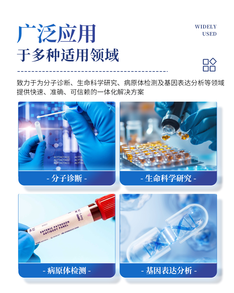 基礎科學研究、病原體檢測、肉制品摻假、轉基因檢測、食品安全檢測、藥物開發及合理用藥、基因表達、水體監測、松材線蟲檢測、寵物檢測、養殖業疫病檢測