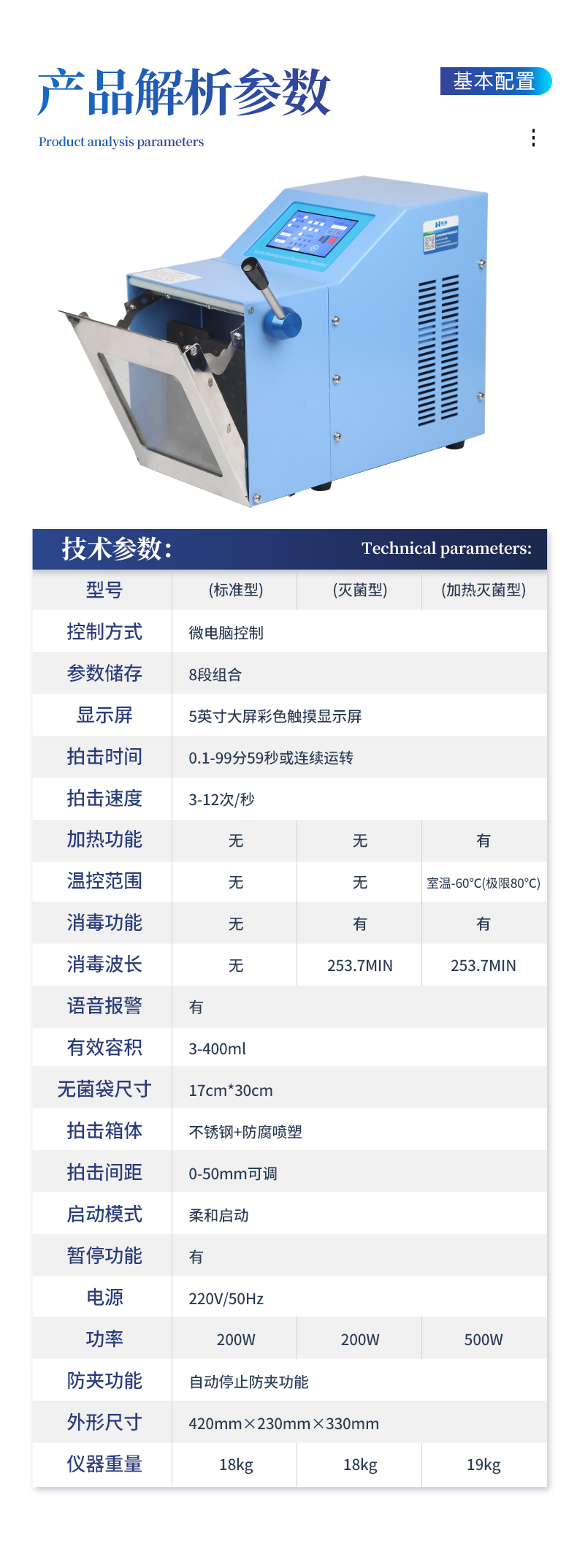●5英寸液晶顯示屏。    ●可儲存三組工作程序。    ●可調整的均質時間。    ●均質速度可調節或固定。    ●拍擊器可調整前后距離。    ●無菌一次性濾袋,保證衛生。    ●全開啟式門,易于清洗。    ●玻璃透明窗口易于觀察 。    ●樣品與均質儀無接觸,如無樣品泄露則不需進行系統清洗.    ●均質柔和、樣品零污染、無損傷、不升溫、不需要滅菌處理,不需洗刷器皿。
