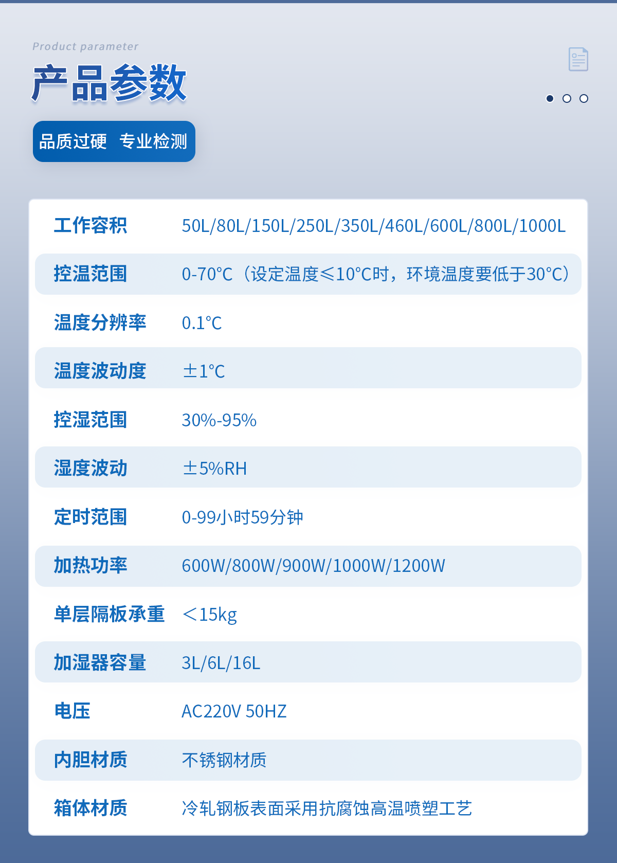 | 工作容積:360L | 控溫范圍:0-70℃(設(shè)定溫度≤10℃時,環(huán)境溫度要低于30℃) | 程序控制:24段 | 溫度分辨率:0.1℃ | 溫度波動度:±0.5℃ | 控濕范圍:30%-95% | 濕度波動:±5%RH | 定時范圍:0-99小時59分鐘 | 加熱功率:900W | 內(nèi)箱尺寸 寬*深*高(cm):60*60*100 | 外箱尺寸 寬*深*高(cm):77*84*162 | 隔板層數(shù)(標(biāo)配):2層 | 層間隔/mm:43 | 卡槽層數(shù):15 | 加濕器容量(標(biāo)配):3L | 單層隔板承重:<22kg | 底部總承重:35kg | 電壓:AC220V 50HZ | 整機重量:112kg | 內(nèi)膽材質(zhì):8K鏡面不銹鋼 | 箱體材質(zhì):冷軋鋼板表面采用抗腐蝕高溫噴塑工藝 | 旗艦款升級項目:升級內(nèi)置鋼化玻璃門,內(nèi)置220V電源插座。 |