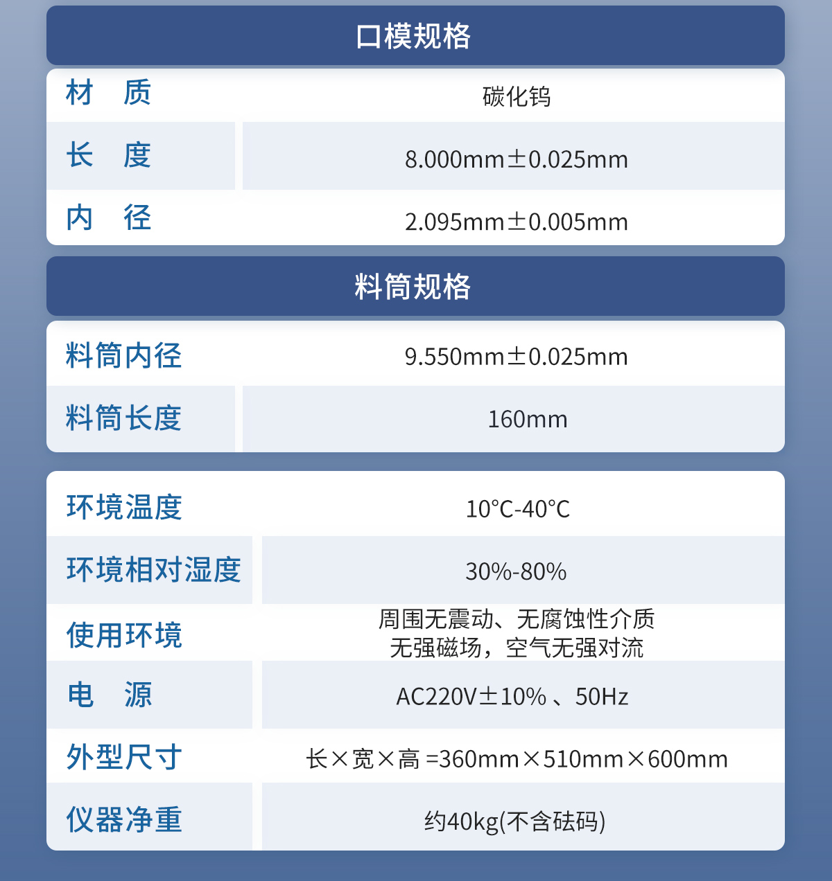 主機是該儀器的中心也稱擠出系統,由爐體、料筒、活塞、口模、砝碼等部件組成。