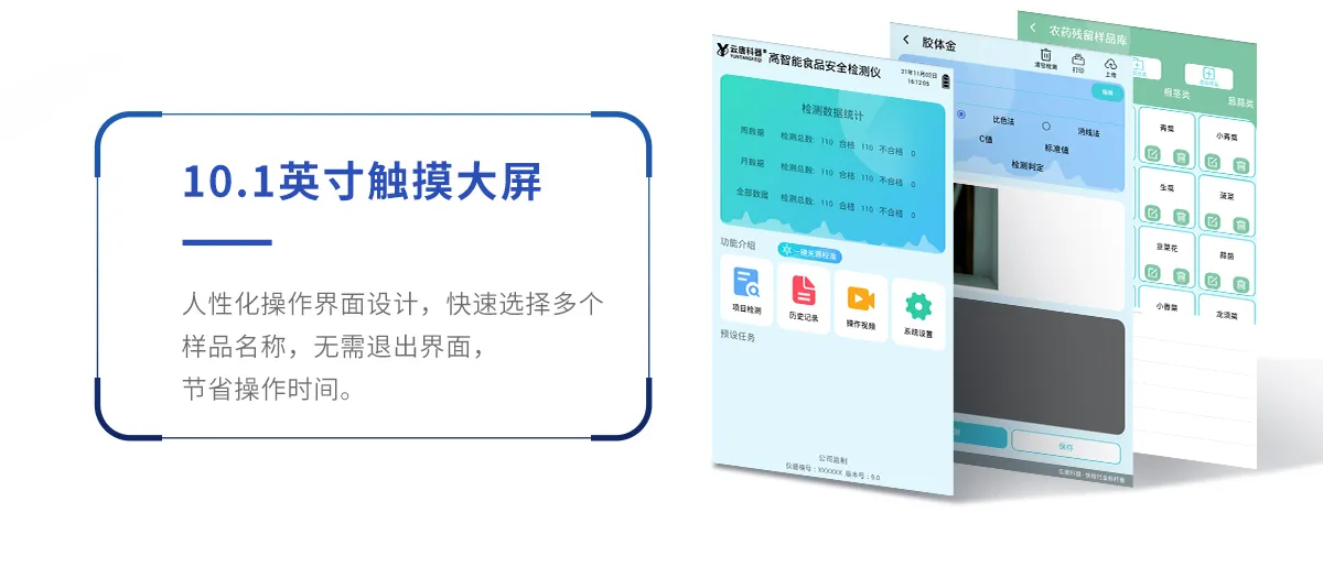 多功能食品安全檢測儀可快速檢測200多項目,包含非食用化學物質、濫用食品添加劑、農藥殘留、獸藥殘留、重金屬、病害肉、營養強化劑、抗生素類殘留、激素類殘留、真菌毒素類殘留、化學類殘留等現場的定性定量檢測。