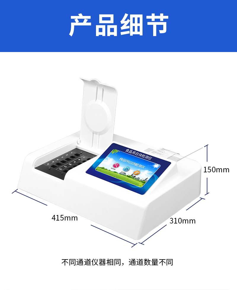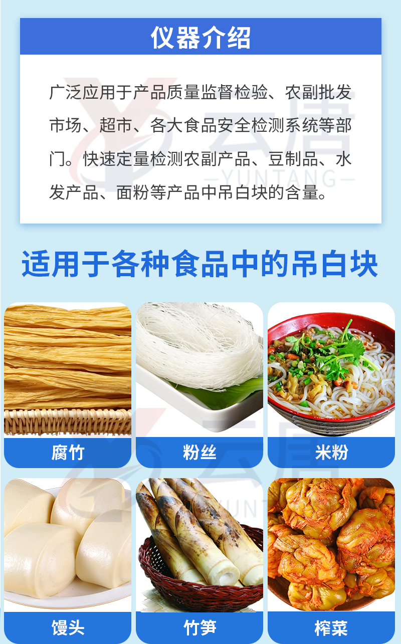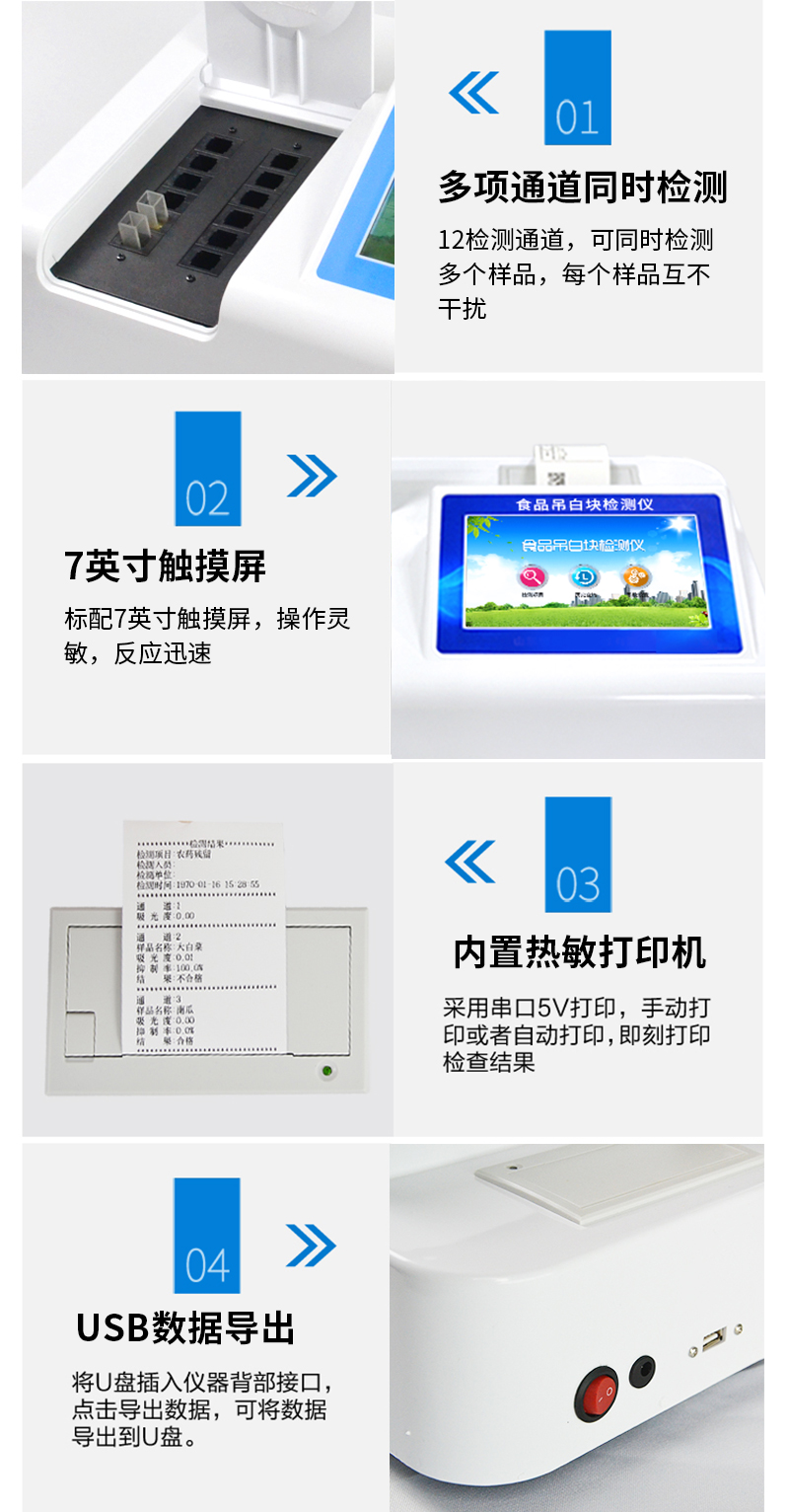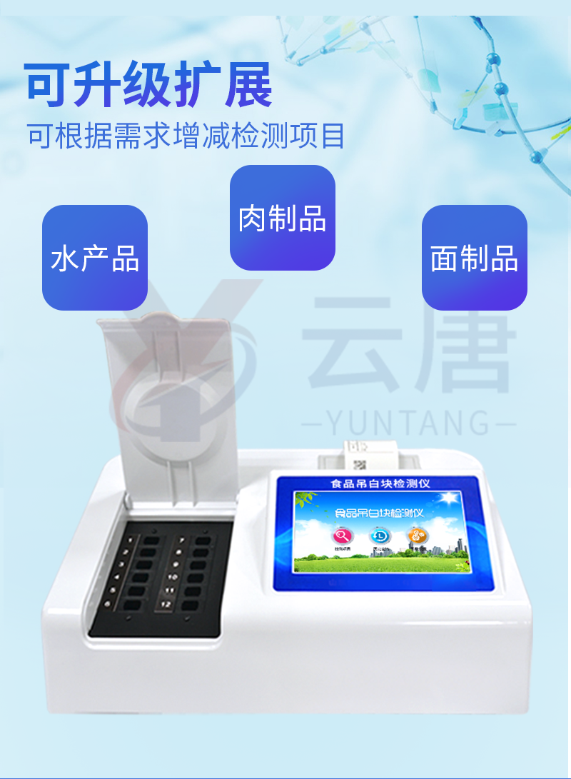1、 檢測項目:用于快速檢測食品中吊白塊,儀器預留其他項目檢測程序和端口,根據(jù)日后需求可方便的自主增加檢測項目。日后可升級為檢測,水產(chǎn)品,肉制品,面制品的綜合類型儀器。