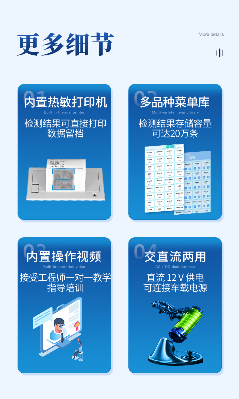| 儀器采用10.1英寸液晶觸摸屏顯,搭配運行安卓智能操作系統,主控芯片采用ARM Cortex-A7,RK3288/4核處理器,主頻1.88Ghz,運轉速度更快速,性能更強。 | 儀器功能包括:膠體金檢測模塊、數字化管理模塊、無線通訊模塊等,可以滿足同一軟件下實現所有檢測項目的檢測,并在同一窗口展示檢測結果。 | 一體化臺式快檢設備,采用交直流兩用供電方式,可連接車載電源,配備6ah大容量充電鋰電池,可以滿足現場及流動檢測使用的需求。儀器尺寸:43×35×20cm, 主機凈重:5.1kg | 系統自帶數據集成模塊,設備首頁自動統計檢測數據包含:周檢測數據、月檢測數據,全部檢測總數量,均包含檢測總數,合格數,不合格數,以及相關柱形分析圖,對各項檢測數據清晰掌握,無需電腦查詢,更加快捷直觀。 | 儀器具有任務預設模塊,可在樣品送檢前提前預設樣品名稱、檢測指標、送檢單位等信息,樣品送檢時一鍵調取保存信息,檢測更加方便快捷。 | 膠體金檢測模塊: 直插式自動掃描方式,可實時顯示金標卡實時圖像,系統自動分析并呈現出CT曲線圖,CT線自動識別,無需手動調整,完成檢測后自動退出檢測卡。 結果判定線可修改,對照值標定值可保存,斷電不丟失數據。 兼容市場上其他膠體金卡,使用耗材不受限制,極大增強用戶使用體驗。 | 儀器檢測系統擁有龐大數據庫,并且構建了完善的檢索、修訂功能。食品庫涵蓋多種樣品名稱,可按需添加或刪除、編輯樣品名稱;產品數據庫以及歷史檢測記錄支持一鍵檢索功能。 | 系統打印自定義化,打印格式多樣化,產品合格證(國家標準要求),二維碼,抽樣信息、檢測信息,受檢信息、復核信息、抽樣日期、檢測日期等信息結果,可按需求自行設置打印內容。 | A4紙版本報告打印功能(可選配):設備擁有兩種結果展示方式,可以自動生成A4打印模板和小票打印模板兩種樣式,可通過WiFi及網線等方式鏈接外置打印機可進行打印 | 儀器具有 wifi 聯網上傳、RJ45網線連接功能,可以快速上傳數據。同步對接監管平臺,數據可局域網和互聯網數據上傳,檢測結果直接傳至食品安全監管平臺。進行區域食品安全監管及大數據分析處理與數據統計,檢測區域食品安全長短期動態,達到食品安全問題預估、預警。 | 設備支持U盤存儲,標準USB接口,免驅動安裝。檢測結果存儲容量20萬條以上,可生成Excel表格,進行一鍵拷貝,并具有登錄保護功能,可設置用戶名及密碼,規范不同人員操作權限,防止非工作人員操作,并且可以進行重新校準、鎖定、恢復出廠設置功能。儀器固件可升級,后期檢測項目可擴充。 | 儀器具備遠程升級功能,可定向分客戶分儀器更新,開機后自動更新,并可持續性免費更新系統版本,無需像傳統產品返廠更新,節省時間及人力成本并避免了物流運輸返廠升級導致設備損壞的潛在風險。 |