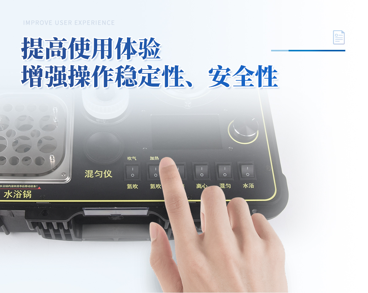 | 1、功能緊湊,集成五種樣品前處理常用的功能,完成樣品一站式處理。 | 2、結構穩固,機箱采用***工程塑料,具備**的抗沖擊性、耐腐蝕性、便攜性。 | 3、操作穩定,機器采用五寸全彩色液晶屏,功能指示性強,用戶操作均為實體開關,杜絕佩戴手套和液體噴濺時的操作失效。 |