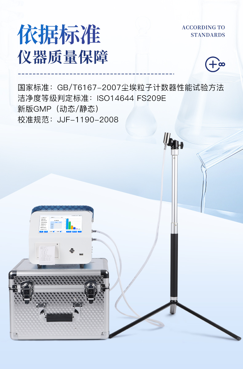 國家標(biāo)準(zhǔn):GB/T6167-2007塵埃粒子計(jì)數(shù)器性能試驗(yàn)方法 潔凈度等級判定標(biāo)準(zhǔn):ISO14644 FS209E ,新版GMP(動(dòng)態(tài)/靜態(tài)) 校準(zhǔn)規(guī)范:JJF-1190-2008