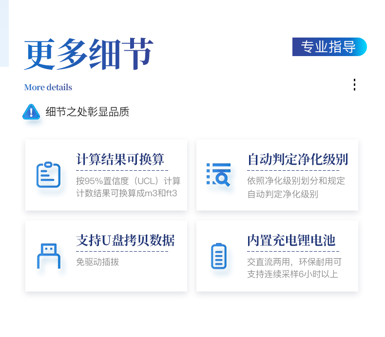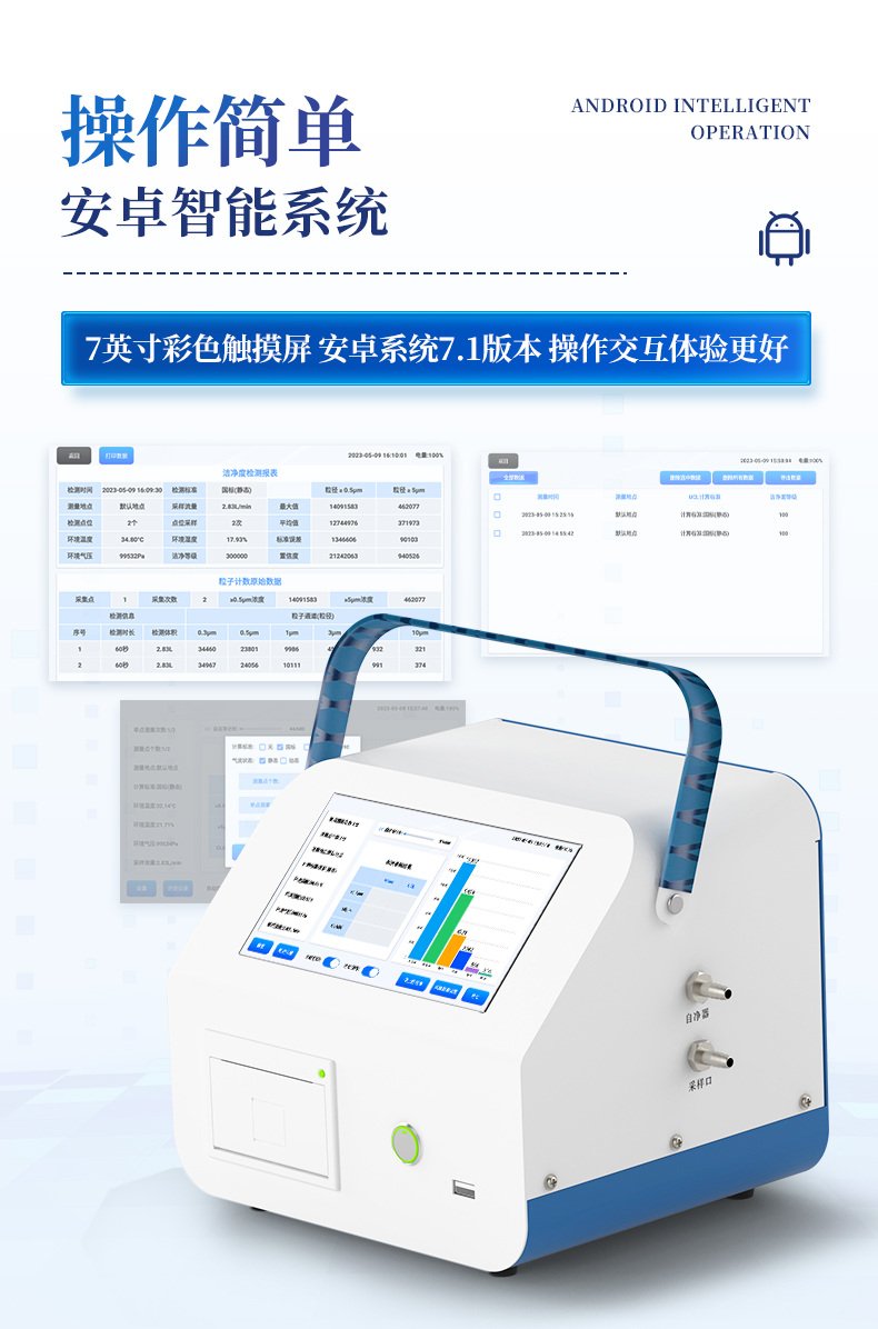 1、安卓系統(tǒng)7.1版本,操作交互體驗(yàn)更好。 2、內(nèi)置溫濕度傳感器、環(huán)境氣壓傳感器 3、核心部件光散射傳感器明顯消除腔體的雜散光,信噪比大為提高。從而使測量更準(zhǔn)確更可靠。 4、按95%置信度(UCL)計(jì)算,計(jì)數(shù)結(jié)果可換算成m3和ft3 5、依照凈化級別劃分和規(guī)定,自動(dòng)判定凈化級別,使用便利。 6、支持wifi、藍(lán)牙傳輸,數(shù)據(jù)可無線上傳;同時(shí)支持U盤拷貝數(shù)據(jù),免驅(qū)動(dòng)插拔。 7、配置監(jiān)管平臺,檢測結(jié)果可直接無線傳至平臺,進(jìn)行潔凈度長短期分析,輔助管理。 8、內(nèi)置新一代高速熱敏打印機(jī),可選擇所需要打印的粒徑通道,靈活打印結(jié)果。 9、交直流兩用,內(nèi)置充電鋰電池,環(huán)保耐用可支持連續(xù)采樣6小時(shí)以上。 10、便捷簡易伸縮式云臺支架,安裝采樣操作更加方便。